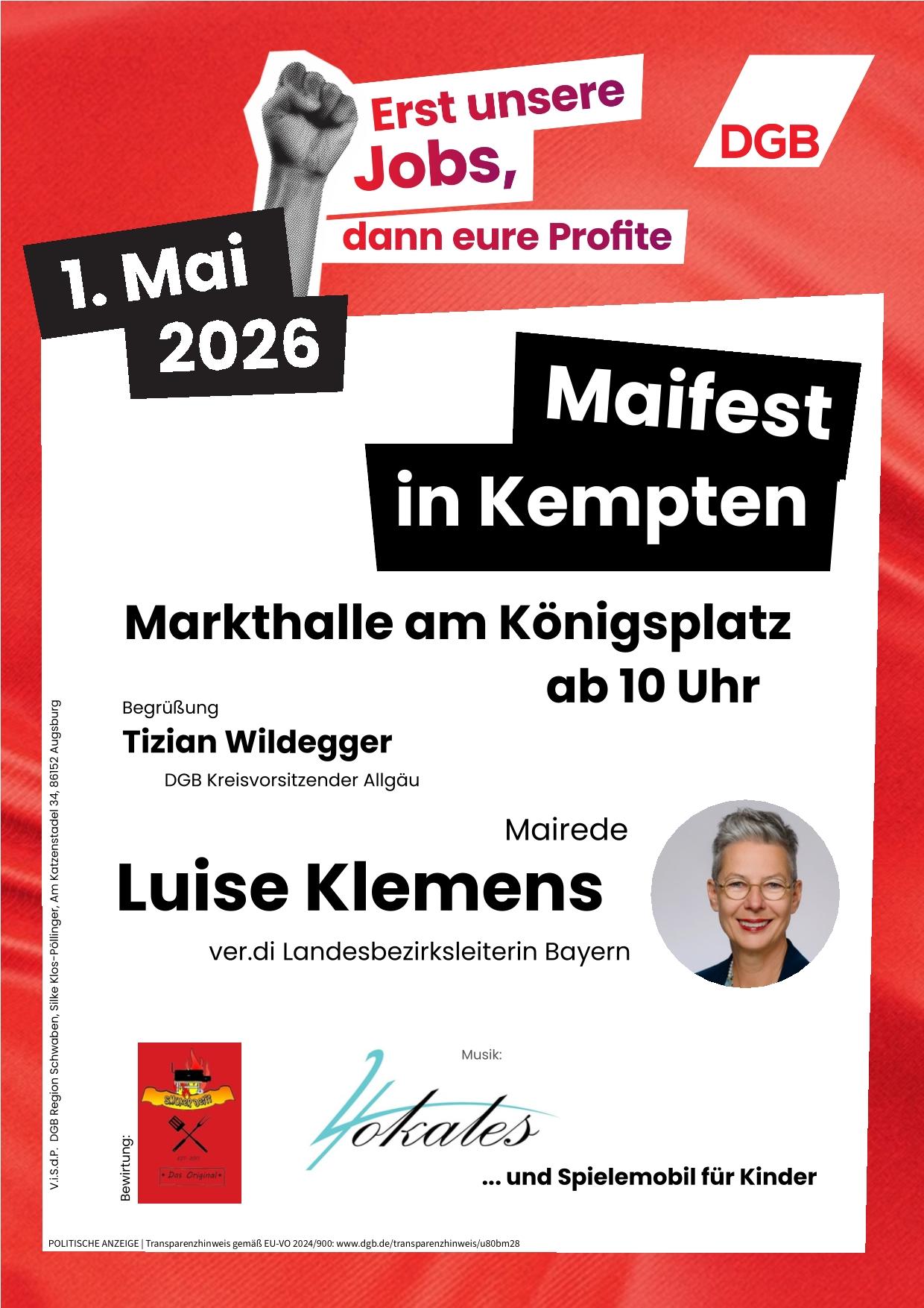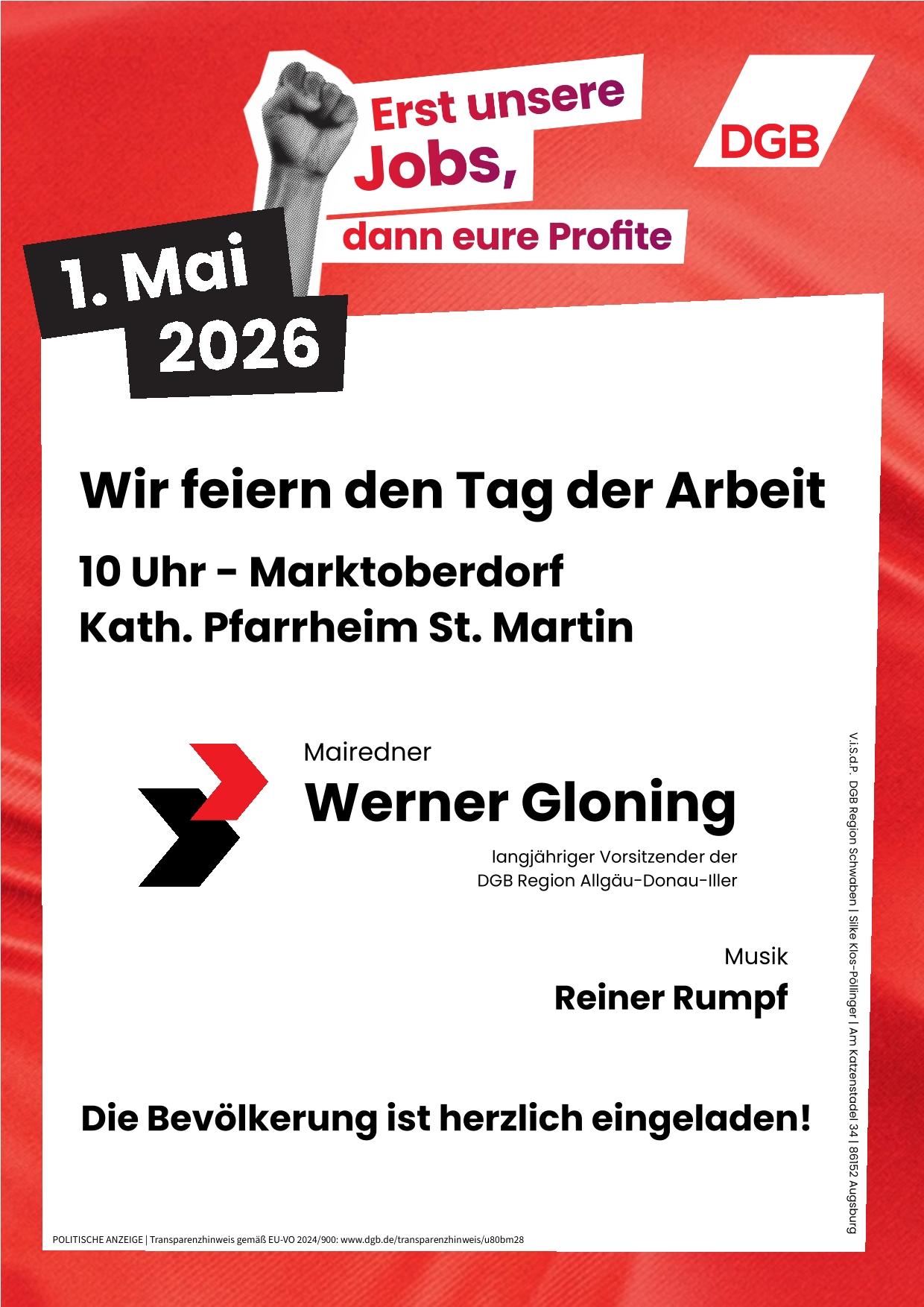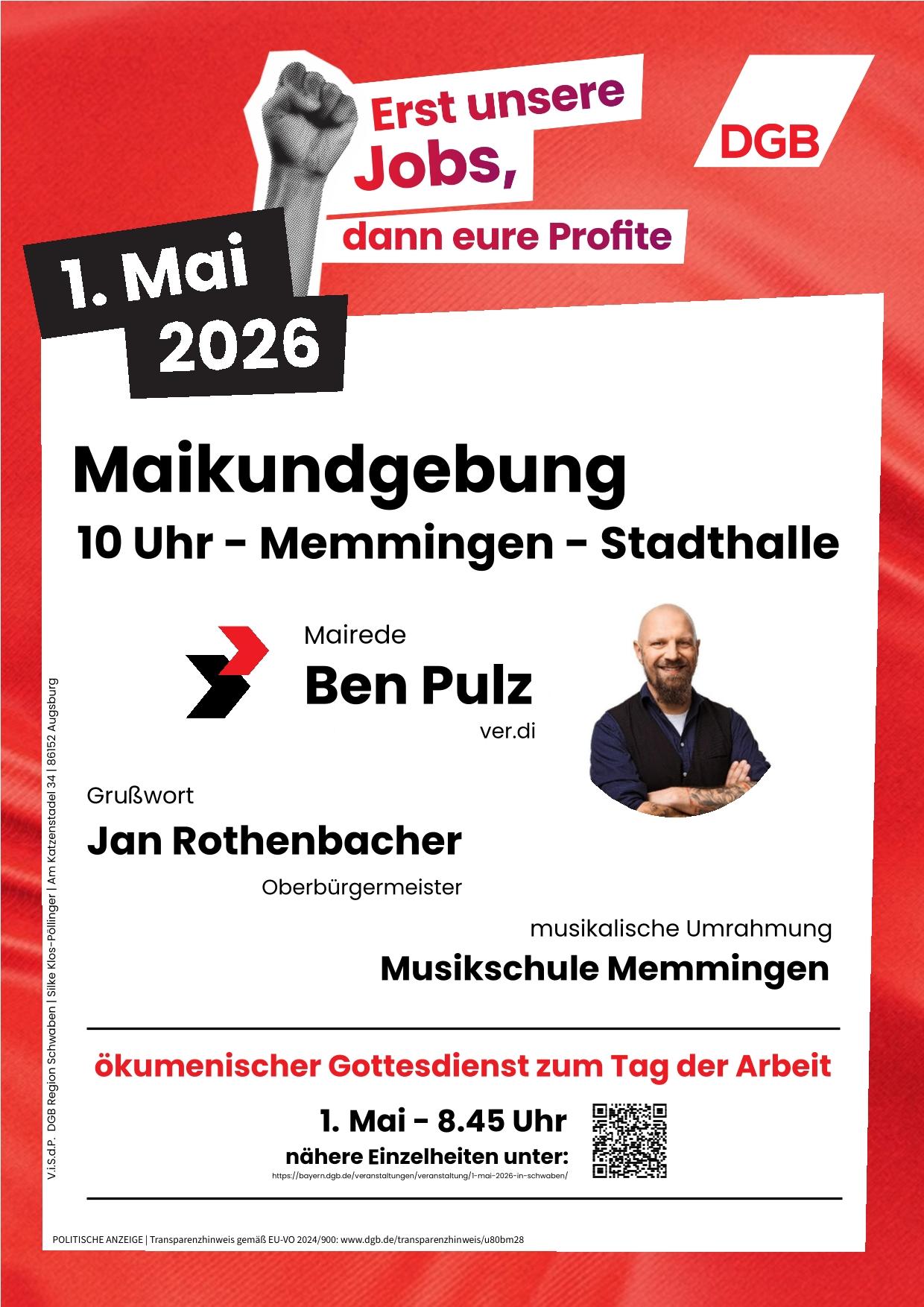 Unter dem Motto „Erst unsere Jobs, dann eure Profite“ gehen wir am 1. Mai 2026 auf die Straße – kämpferisch, solidarisch und entschlossen. Arbeitsplätze geraten unter Druck, Standorte werden verlagert, soziale Sicherheit wird infrage gestellt. Die Politik fordert eine Erhöhung der Arbeitszeit, weil Beschäftigte angeblich zu oft „krankfeiern“. Und auch an unsere hart erkämpfte Lohnfortzahlung im Krankheitsfall wollen sie ran.