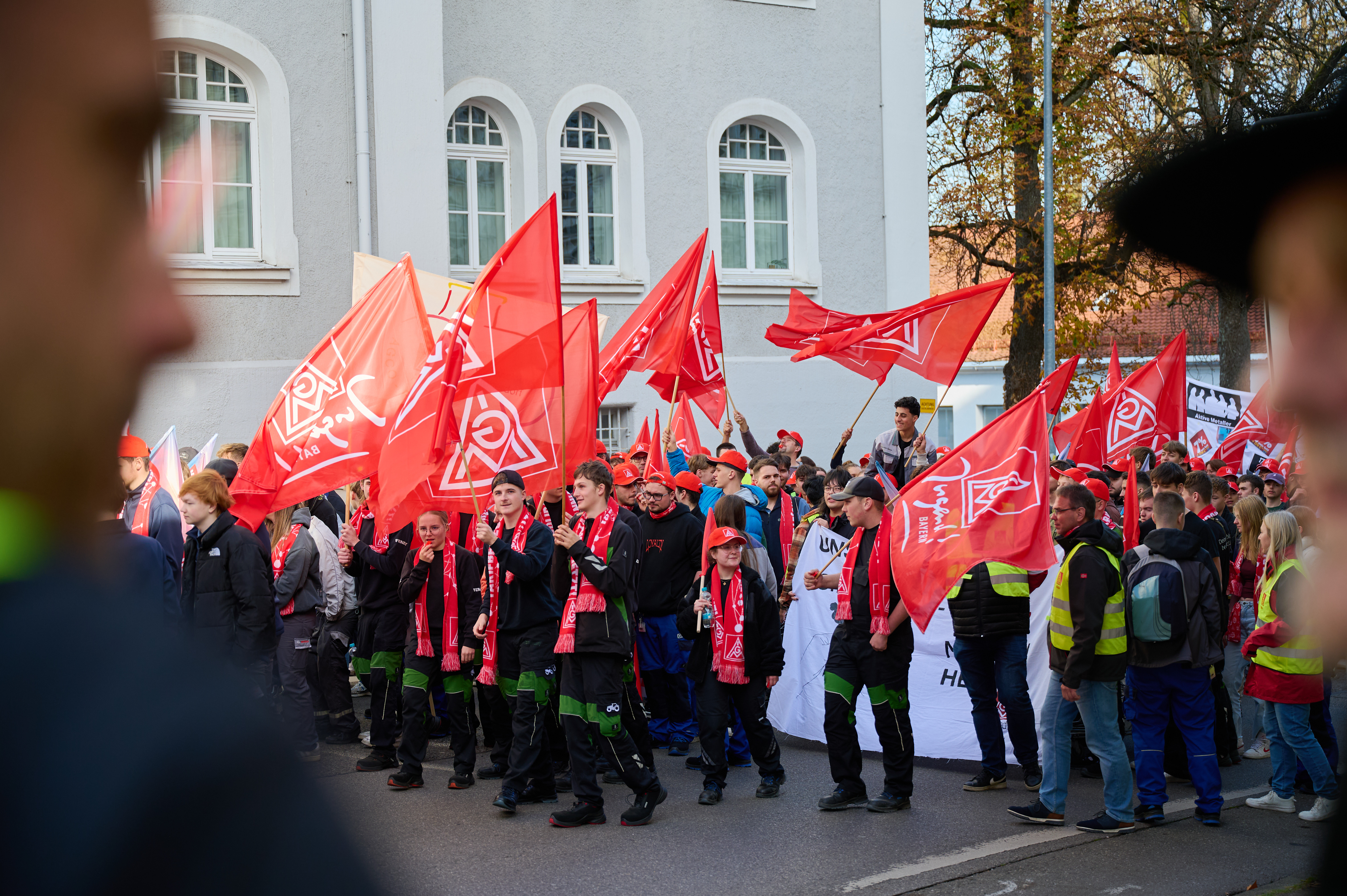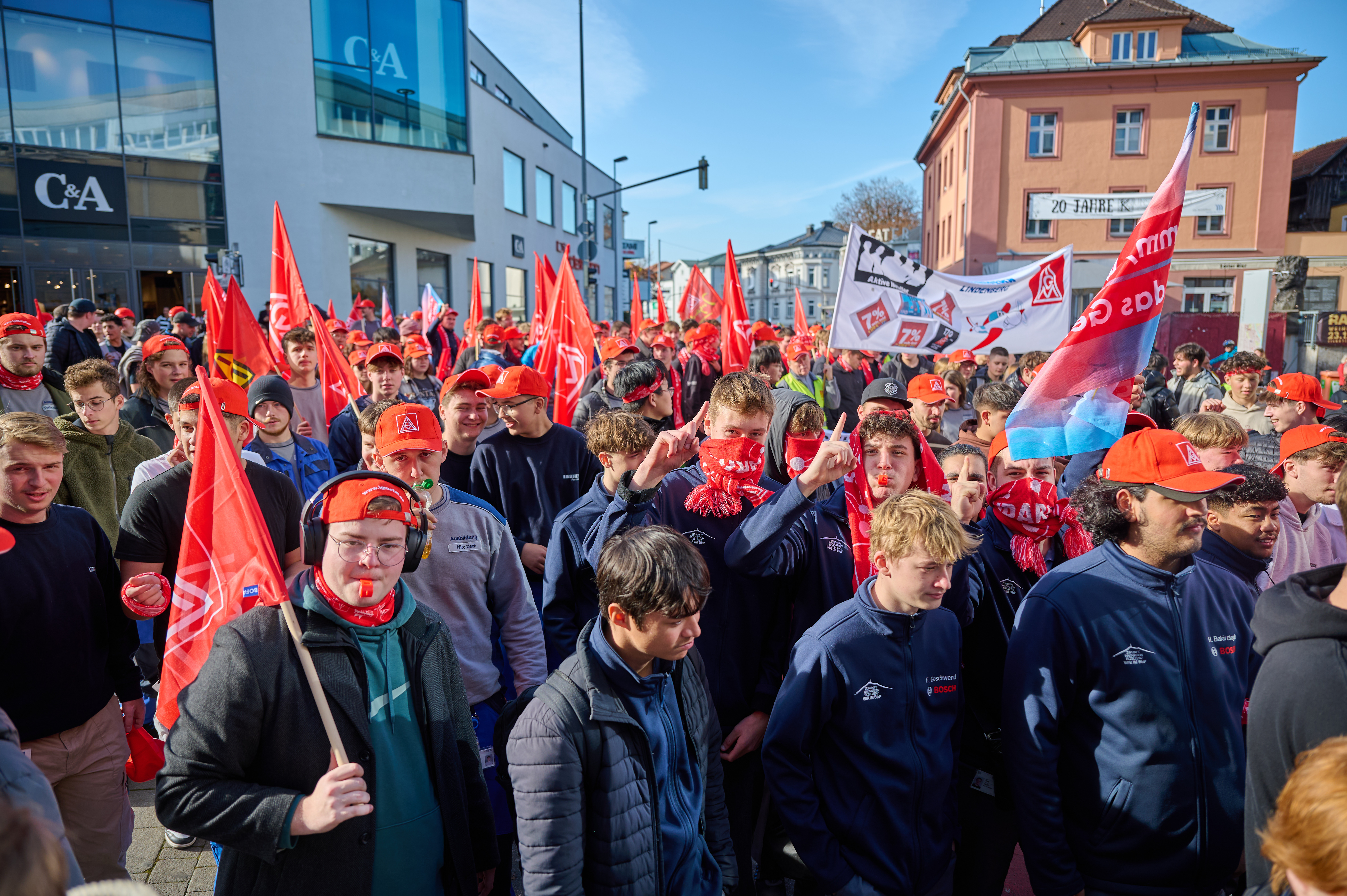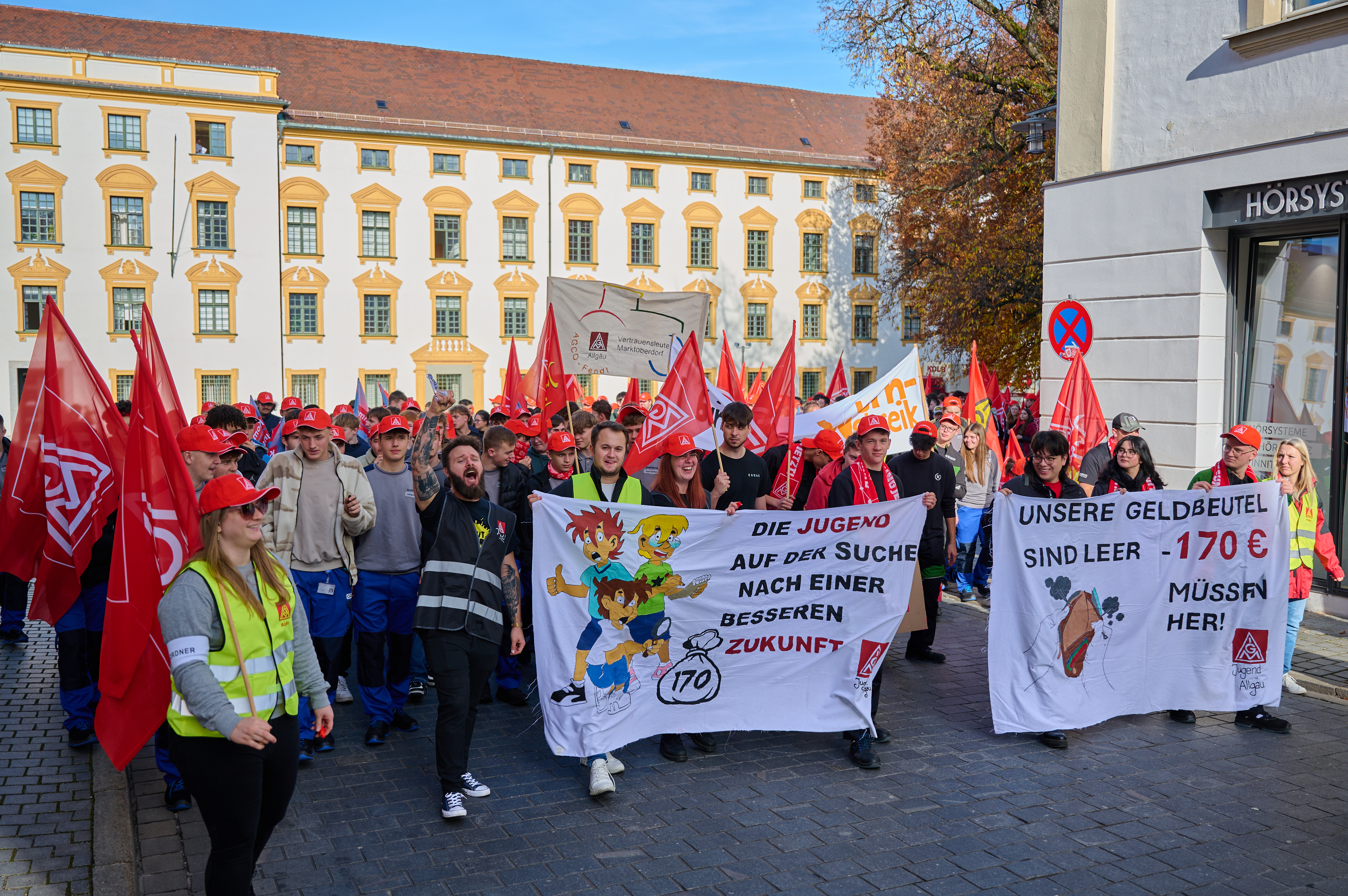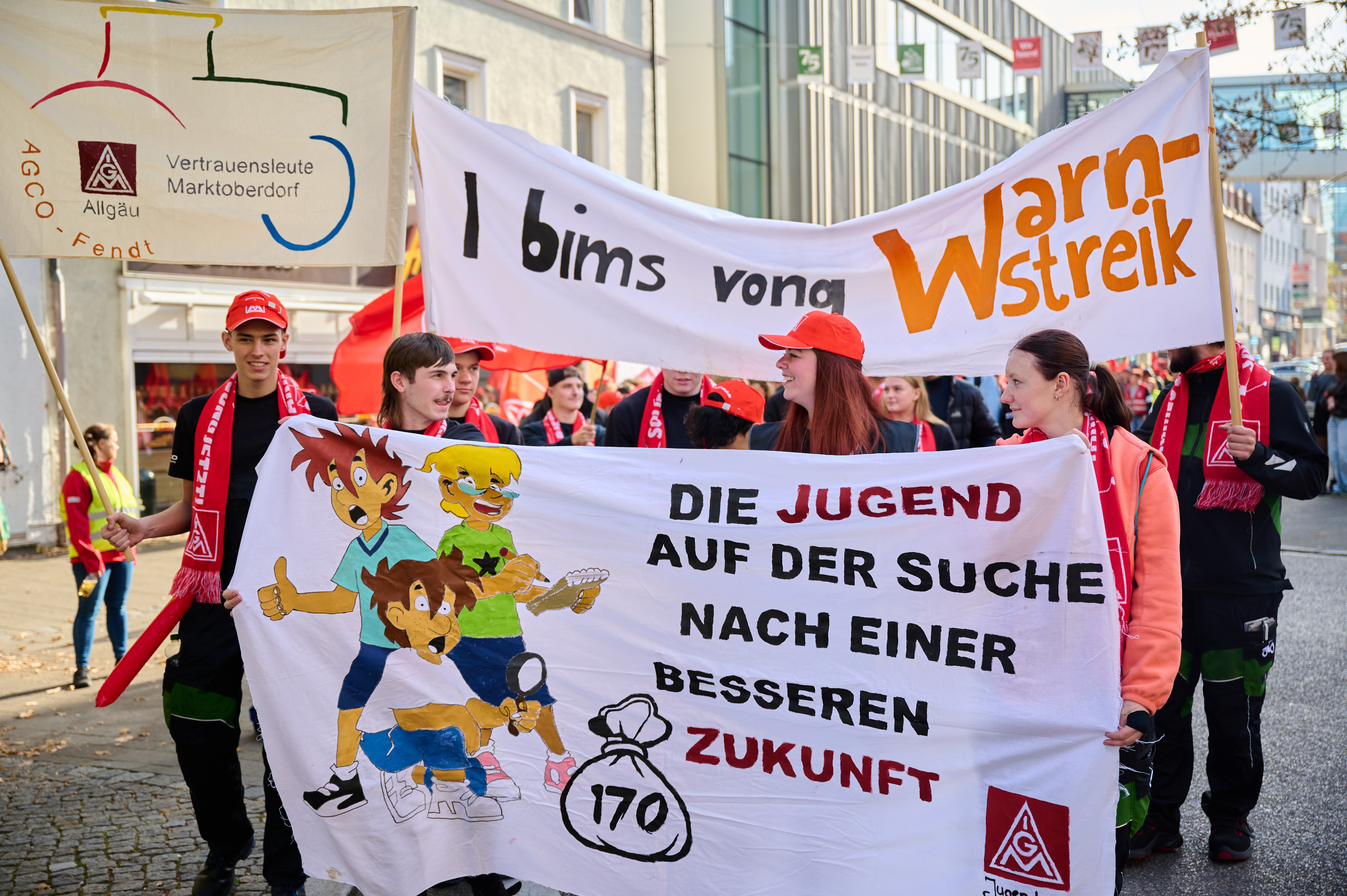 300 Auszubildende aus dem ganzen Allgäu legten am 06.11.2024 Kempten lahm. Um 11:30 Uhr versammelten sich Auszubildende von GROB-Werke, Bosch, Rohde & Schwarz, Liebherr Lindenberg, Goldhofer, DMG Mori Pfronten, AGCO Fendt und Voith an der Allgäu Halle in Kempten um für 170 Euro mehr Ausbildungsvergütung zu streiken. Mit Brotzeit, Musik und einer kämpferischen Rede von Carina Negele, zuständig für Jugendarbeit bei der IG Metall Allgäu, wurde der Azubi-Warnstreik eröffnet Es folgte ein Demozug durch die Innenstadt mit abschließender Kundgebung an der Markthalle. „170 Euro sind keine überzogene Forderung sondern eine erste Investition in eine gemeinsame Zukunkft!“ so Carina Negele, in ihrer Rede. Jetzt sind die Arbeitgeber dran und müssen in der vierten Verhandlung am 11.11.2024 ein narrensicheres und wertschätzendes Angebot für die Auszubildenden und für die Zukunft vorlegen.