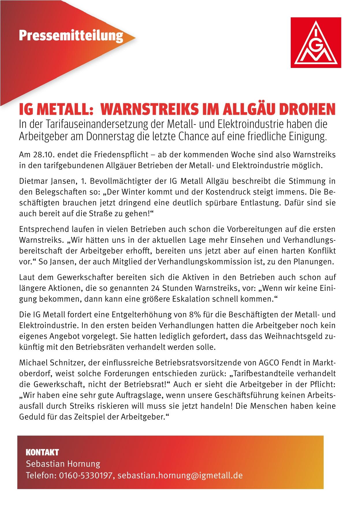 Am 28.10. endet die Friedenspflicht - ab der kommenden Woche sind also Warnstreiks in den tarifgebundenen Allgäuer Betrieben der Metall- und Elektroindustrie möglich.