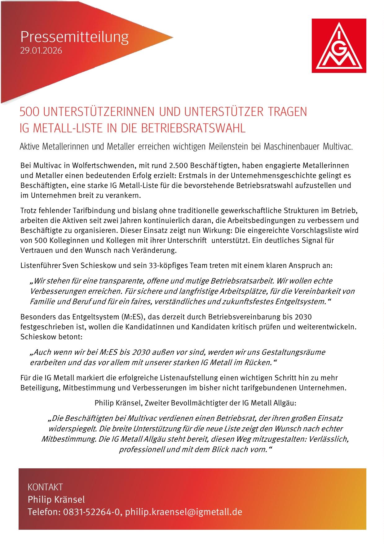 „Die Beschäftigten bei Multivac verdienen einen Betriebsrat, der ihren großen Einsatz widerspiegelt. Die breite Unterstützung für die neue Liste zeigt den Wunsch nach echter Mitbestimmung. Die IG Metall Allgäu steht bereit, diesen Weg mitzugestalten: Verlässlich, professionell und mit dem Blick nach vorn.“