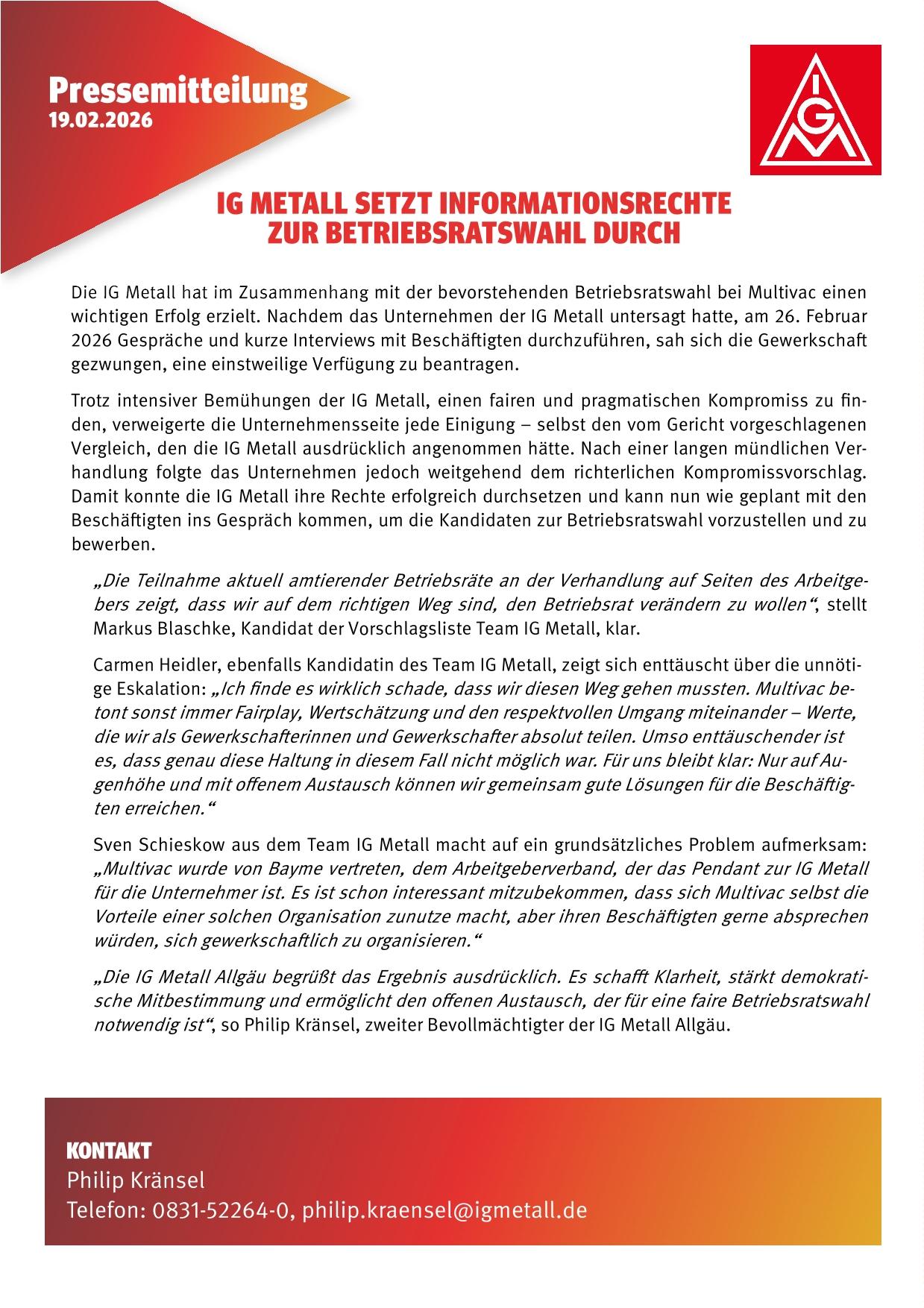 Die IG Metall hat im Zusammenhang mit der bevorstehenden Betriebsratswahl bei Multivac einen wichtigen Erfolg erzielt. Nachdem das Unternehmen der IG Metall untersagt hatte, am 26. Februar 2026 Gespräche und kurze Interviews mit Beschäftigten durchzuführen, sah sich die Gewerkschaft gezwungen, eine einstweilige Verfügung zu beantragen.