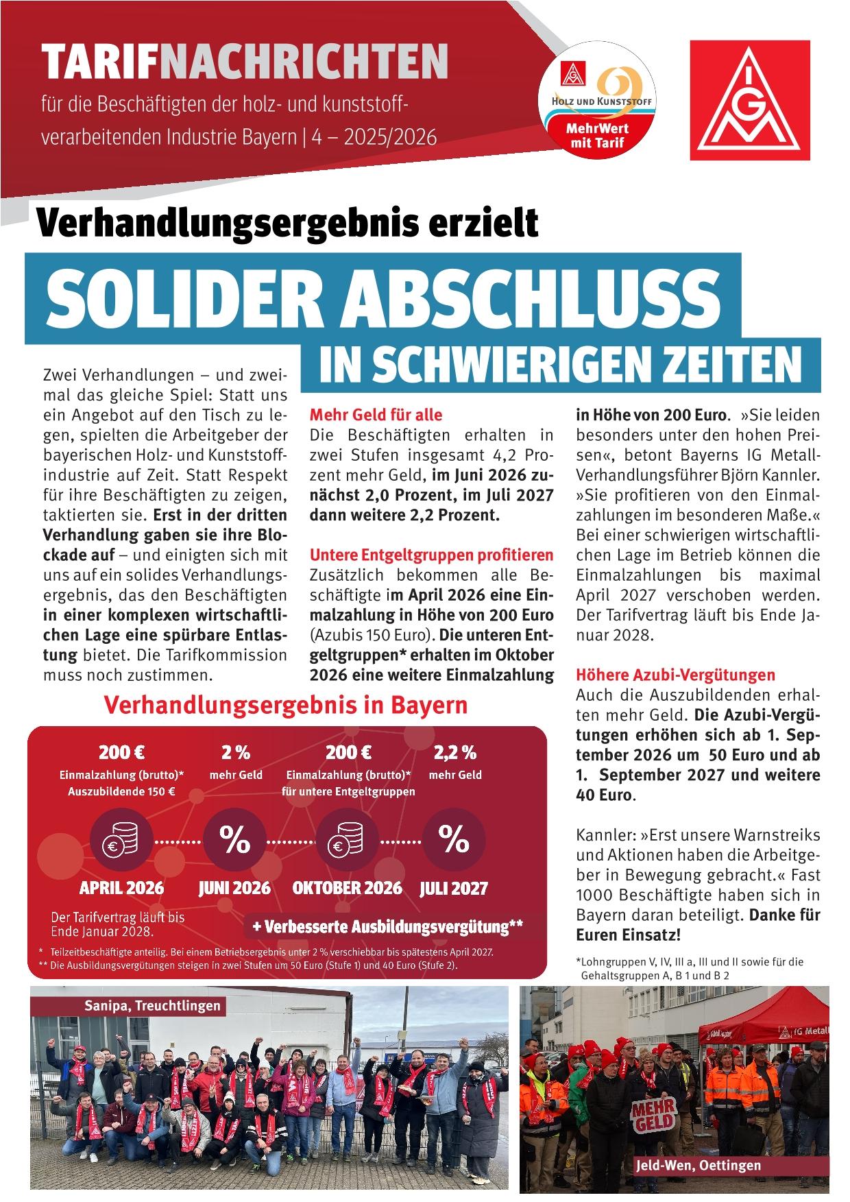 Die rund 10.000 tarifgebundenen Beschäftigten der bayerischen holz- und kunststoffverarbeitenden Industrie erhalten in zwei Stufen insgesamt 4,2 % mehr Geld. Im Juni 2026 erhöht sich das Entgelt um 2 %, im Juli 2027 dann um weitere 2,2 %.Zusätzlich bekommen alle Beschäftigen im April 2026 eine Einmalzahlung in Höhe von 200 €.